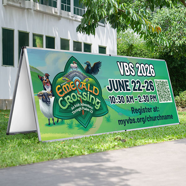 • Step 2: Customize! Add your church name, VBS dates, registration info, and any other essential info to your banner. You can even add a QR code or upload your church logo!