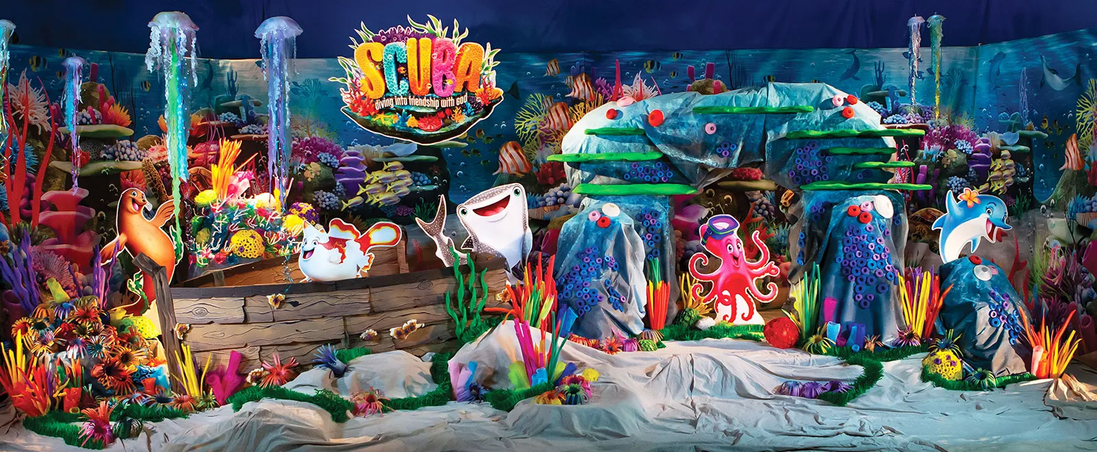 Order Bible Memory BuddiesImagine shelves adorned with coral reefs showcasing the brilliant hues of a wide variety of sea creatures, giving a fresh interpretation to the idea of living waters. Your Scuba Vacation Bible School decorations will infuse your church with the sparkling essence of water and the vivid allure of the undersea world. This visual spectacle is bound to leave a lasting impression in the hearts of both kids and families, a memory to cherish for years.